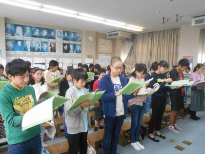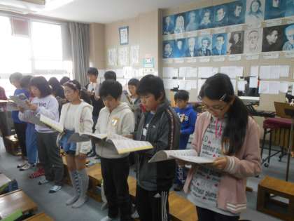 「春風の中で」「旅立ちの日に」という歌の合唱練習をしています。