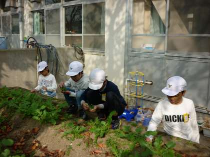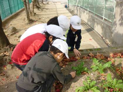 大根の葉と見分けて、手の中がいっぱいになるほど雑草を抜きました。畑がすっきりしました。