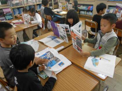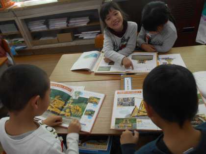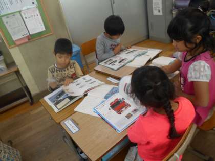 「じどう車くらべ」の学習です。今日はいろいろな自動車の図鑑を読んで「しごと」と「つくり」を調べました。図鑑から知りたいことを読み取ることには苦戦していましたが,いろいろな自動車があることに驚き,楽しんで読んでいました。