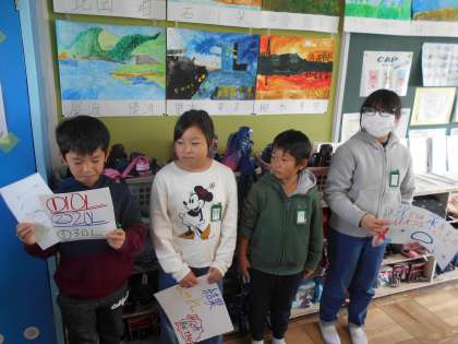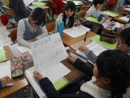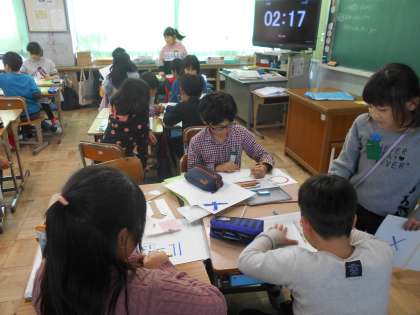 節水の発表をまとめています。グループで分かりやすく発表するための工夫を話し合っています。