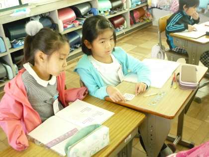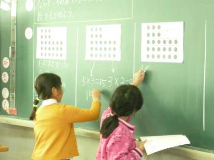 いろいろな方法でかけ算の式が考えられることを知りました。最後に先生からの問題をペアで解きました。