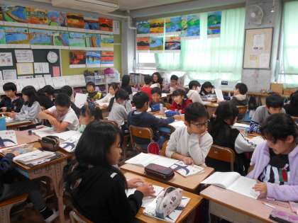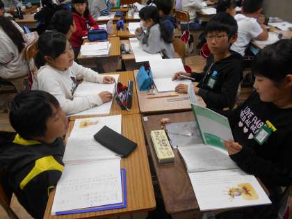 「プラタナスの木」で一番心に強く残ったところを,理由とともにグループで交流しています。同じところを選んでいる人やちがうところでもなるほどと感じるところを選んでいる人がいることを知ることができました。