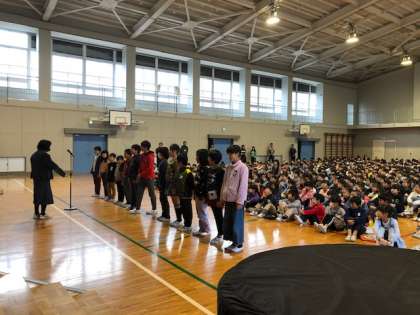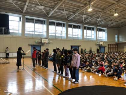 全校朝会で,はとぶえコンクールの入賞者の表彰式がありました。