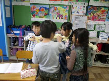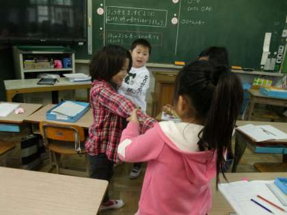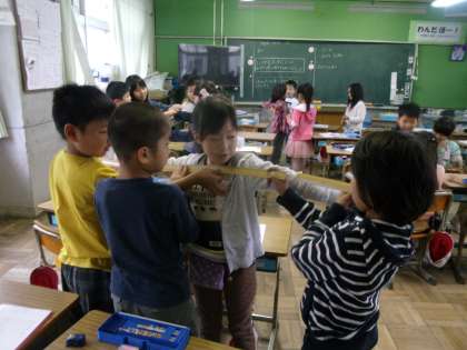 ものさしを使って,友だちが伸ばした手の端から端までの長さを測ってみました。