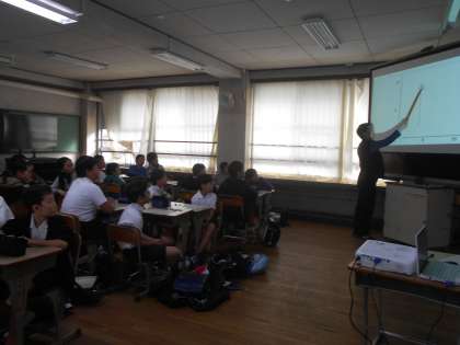 数学では、パソコンとプロジェクターを使って点の動きで図形を書きました。