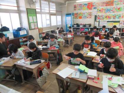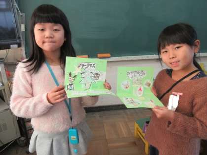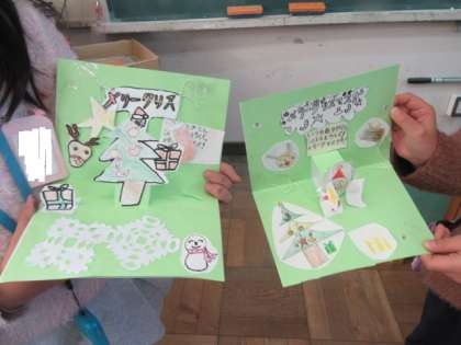 白い紙を折って,切って,雪の結晶を作ってはったり,飛び出す部分に,ツリーやケーキ等クリスマスにちなんだものをはったり,糸に靴下などをぶら下げたものを飾ったりといろいろ工夫ができました。