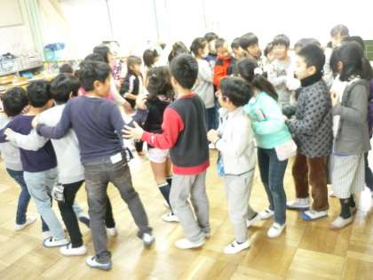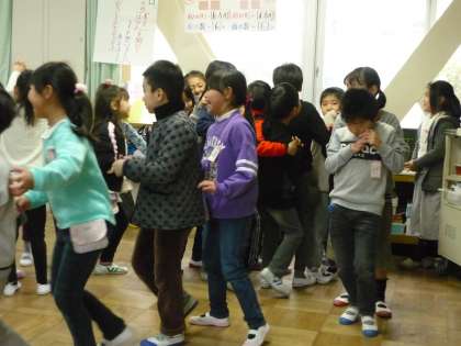 今日は雨だったので,みんな遊びは教室で「ロンドン橋」を歌いながら遊びました。リズムに乗って楽しく遊びました。