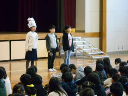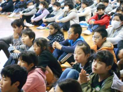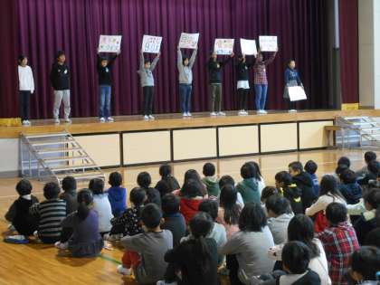 児童集会で,児童会や各委員会からのお知らせを聞いています。保健・給食委員会によるわくわくフェアの説明があり,4年生はクイズに挑戦します。