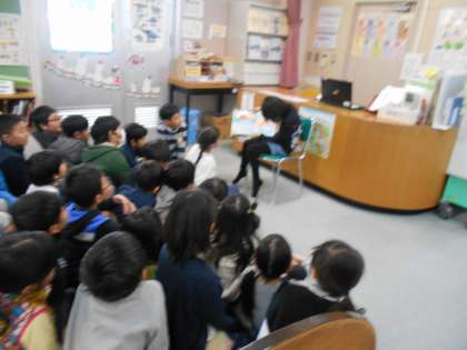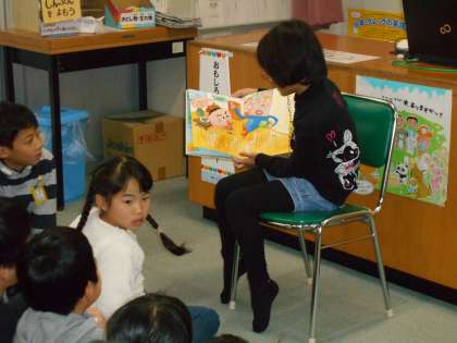 読み聞かせ会社による読み聞かせです。みんな真剣に聞き入ります。