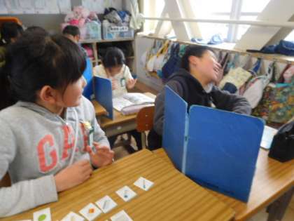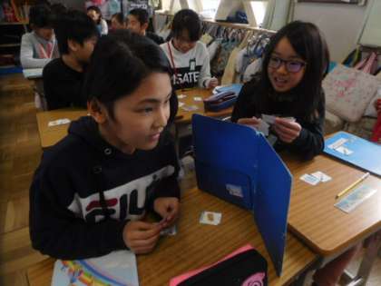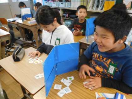 文房具のカードを使って,ペアでゲームをしています。ペン,マグネット,ノートブックなどと,英語で自然と発声しています。