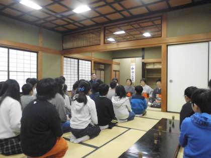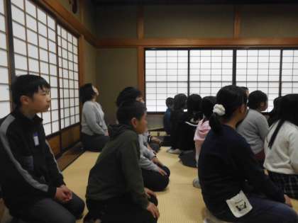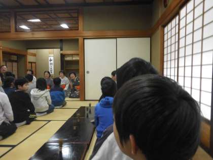 次に日本庭園の横で茶の湯の体験をしました。はじめに正座の仕方や立ち方,茶道の心得など,茶道の先生方から大事な話を聞きました。