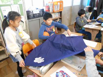 「ふろしき」の学習をしました。実際に包んでみると,いろんな形に変わり,昔の人が重宝した理由がわかりますね。