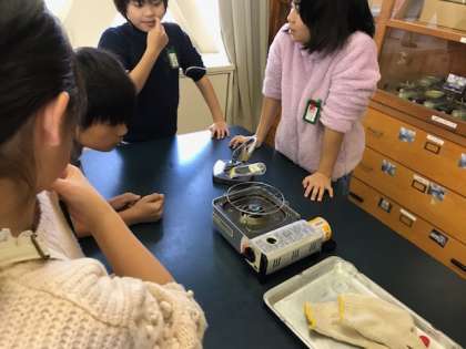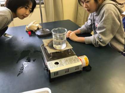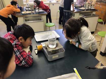 理科の実験で,水の温まり方を見ました。温めているところではなくて違うところから温まる結果が出て,驚きながらもなぜなのかをしっかり考えていました。