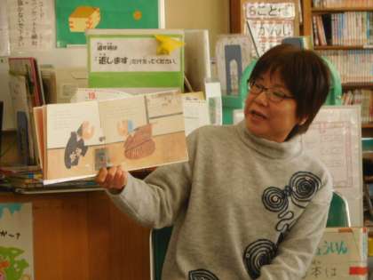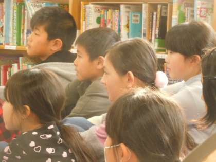 2学期の図書係さんから新しい図書係さんにバトンタッチしました。返却,貸出のチェックのしかたを教えてあげていました。図書サポーターの先生から読み聞かせをしてもらいました。