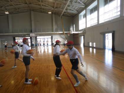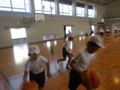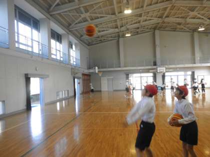 3学期の体育館の体育はバスケットボールです。今日はドリブルやシュートをした後,簡単なゲームをしました。