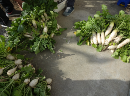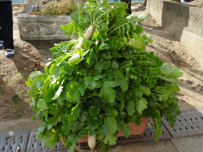 みんなで収穫した大根は、箱に収まりきらないほど大量でした。種類別に分けて、持ち帰ります。どんな風にして食べたのか聞けるのが楽しみです。
