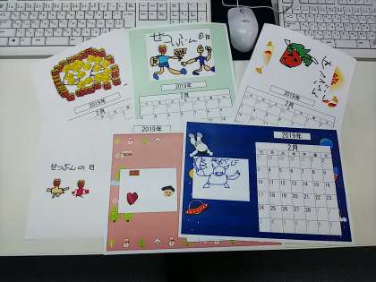 今日のなかよしパソコンは,2月のカレンダーを作りました。2月といえば,「節分」や「バレンタインデー」ということで,豆まきの絵を描いたり,チョコを渡している人の絵を描いたりしていました。作り終わった後は,今度行くお別れ遠足の行き先をインターネットで調べていたり,キューブきっずで遊んだりしました。