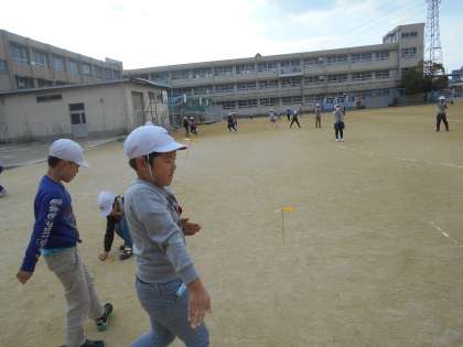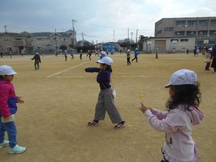 竹とんぼをしました。片手をしっかり前に出すこと,斜め上に向かって飛ばすことを意識して上手に飛ばせるようになりました。