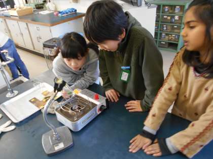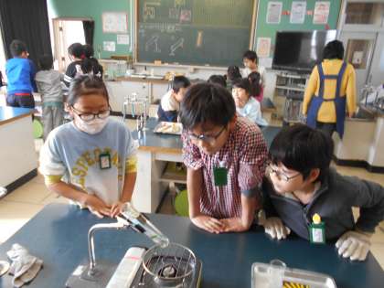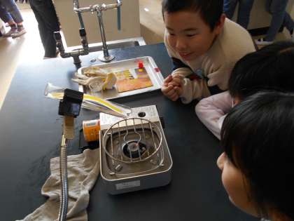 試験管の水を温め,中に入れたサーモテープの色の変化を見ています。水の温まり方は,どのように温まっていくのかな。