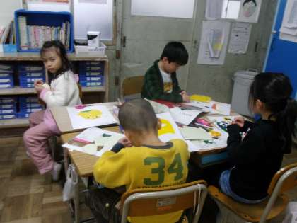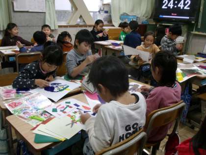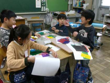 表情や紙の貼り方などを工夫しながら,おにのお面作りを楽しんでいます。
