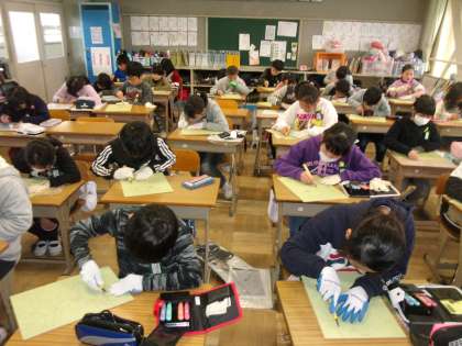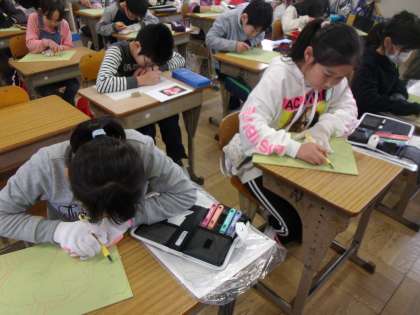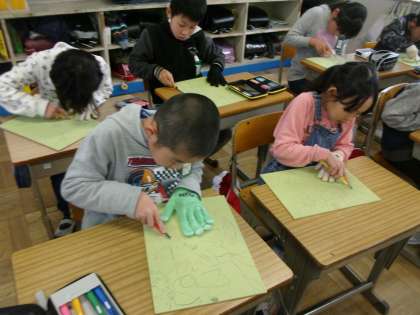 彫刻刀で下書きの線を掘っています。画板をおさえる手が前に来ないように掘る手の下に入れて,丁寧に掘っています。