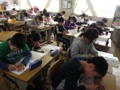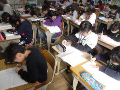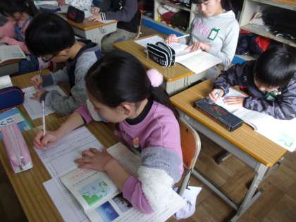 原稿用紙に「ウナギのなぞを追って」を要約しています。自分が大事だと思って線を引いた本文を組み合わせながらまとめています。