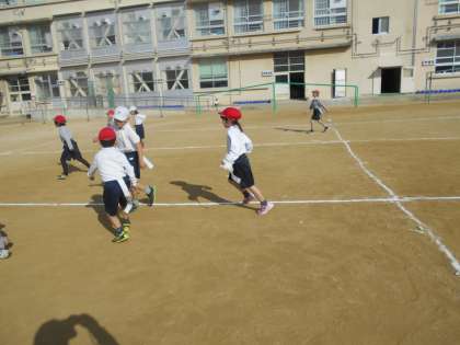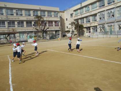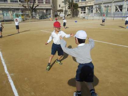 鬼遊びをしました。2チームに分かれてコートの中でタグを取ります。