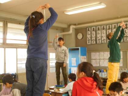 教室の上の方の気温を測ると,温度計のメモリがどんどん増えていきました。上の方があたたかいことがわかりました。