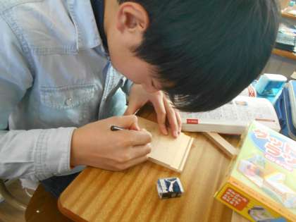 紙にあらかじめ書いたデザインをラックの板に書き込んでいきます。