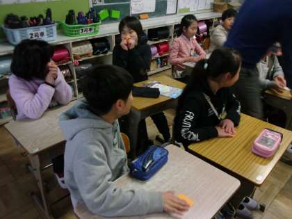 「Who are you?」ゲームをしています。配られたキャラクターになりきって,相手は誰なのか当てるゲームです。