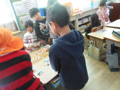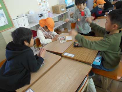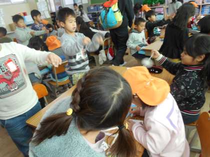 後半はむかし遊び交流をしました。子ども園の子にぶんぶんごまをつくらせてあげて遊びました。その後は色々な昔遊びを一緒に楽しみました。