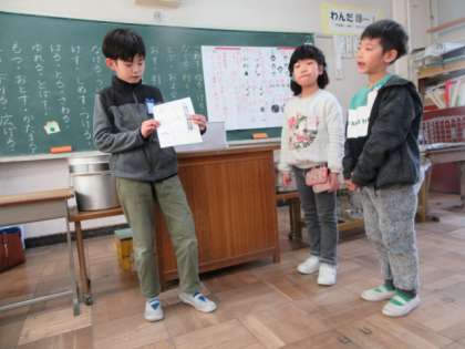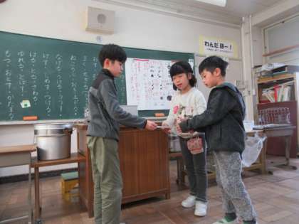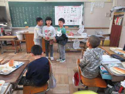 2月になったので,給食委員会の人が,給食目標を届けに来てくれました。日直さんが受け取りました。「好き嫌いをなくそう!」をがんばりましょうね!