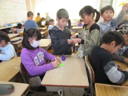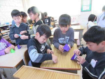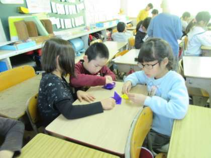 2年生も,少しずつ折り鶴を作り始めています。折れる人が折れない人にやさしく教えてあげていて,素敵です!
