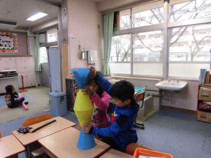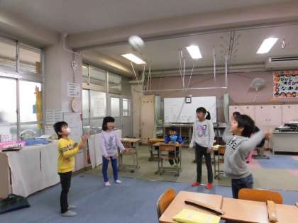 今日は雨だったので、休み時間は教室で遊びました。仲良く遊んでいる様子です。