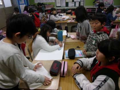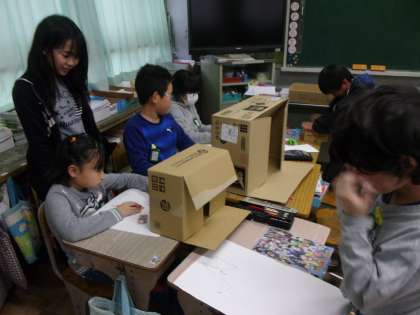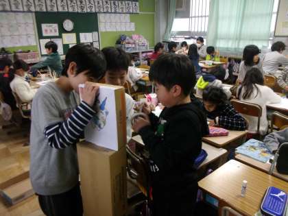 なかよし交流会に向けて,的あてと射的グループに分かれて制作しています。