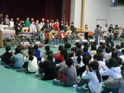 6年生の音楽発表を聴きました。かっこいい姿,迫力のある音に拍手を送っています。