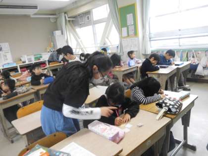 低学年の児童のそばについて優しく教えたり声をかけたりしていました。