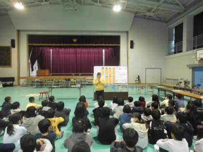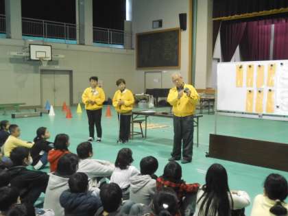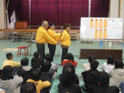 今日はキャップハンディ体験がありました。2・3組は午前,1・4組は午後と2クラスずつに分かれて行われました。最初にどんな活動をするかスタッフの人から説明がありました。
