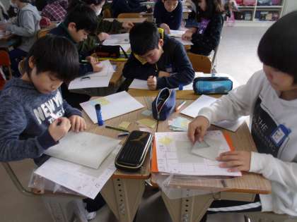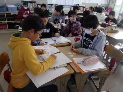 交流タイムに書いてもらったメッセージを、色紙に貼っています。