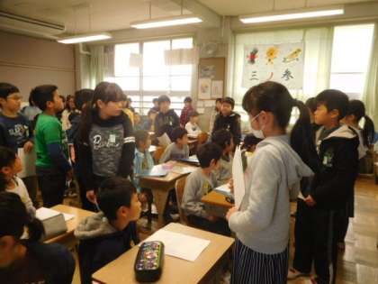 授業で作ったクラブリーフレットを渡しに3年生の教室へ行きました。来年からクラブが始まるので,読んでもらえたらうれしいですね。