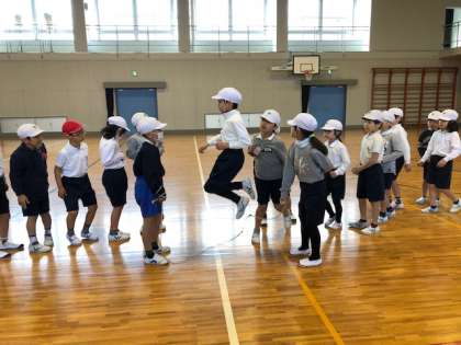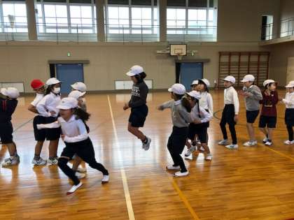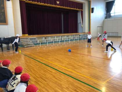 5時間目の体育館体育で,長縄をした後,キックベースをしました。