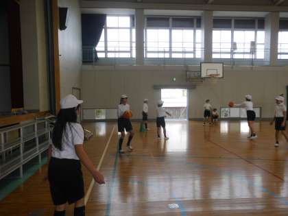 バスケットボールをしました。今日からオールコートで試合を行いました。試合前にドリブル,パスなどをしました。