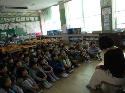 今日は1年生最後の「おはなしはなたば」でした。「三枚のお札」「あなのはなし」というお話,「ぼく,だんごむし」「ねこぶたニョッキのおつかい」という絵本でした。
