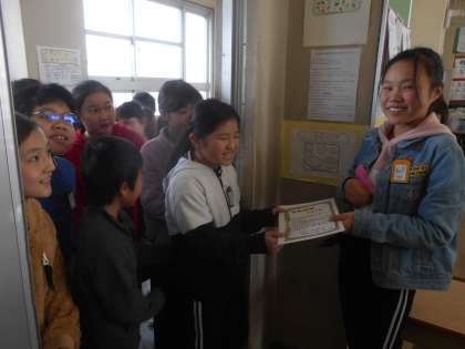 4年生がお別れ集会で紹介してくれた各クラスへの「卒業証書」を渡しに来てくれました。