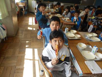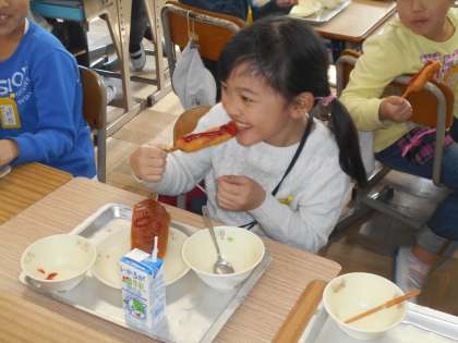 給食はアメリカンドッグが出ました。みんな笑顔でほおばっています。
