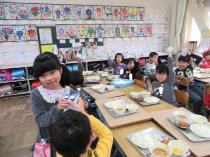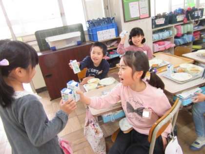 今日が,お誕生日の人と牛乳で乾杯しました。