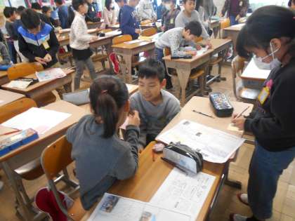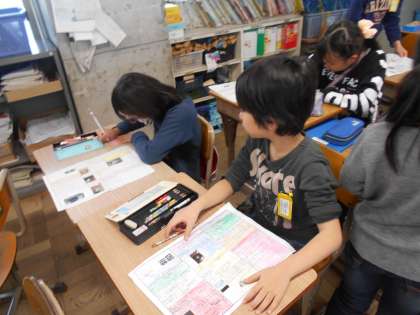 一生懸命作った社会新聞をみんなで見せ合います。付箋にいいとこ見付けをして,交流します。