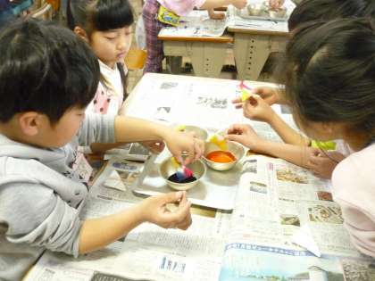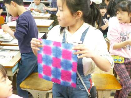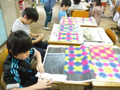 おり染めをしました。とてもかわいらしい模様ができ,楽しみながら作りました。