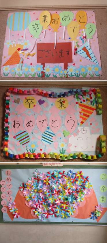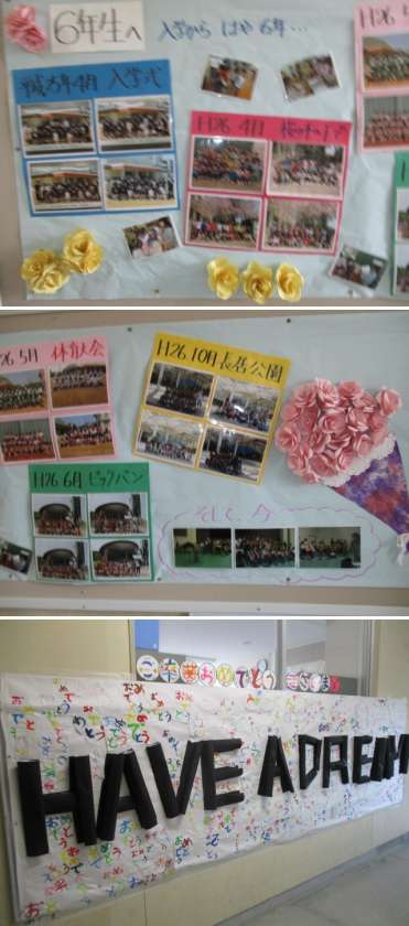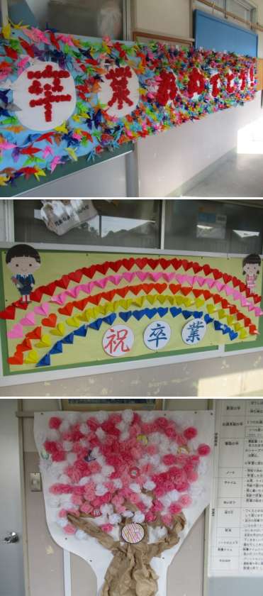会場の準備も整い、校舎は卒業を祝うメッセージでいっぱいです。