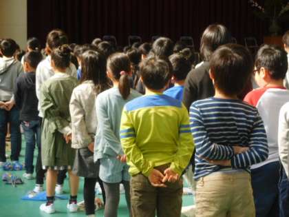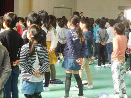 新しい学年の場所に集まり,新しいクラスの友だちと始業式に参加しました。声を響かせて校歌を歌うことができました。